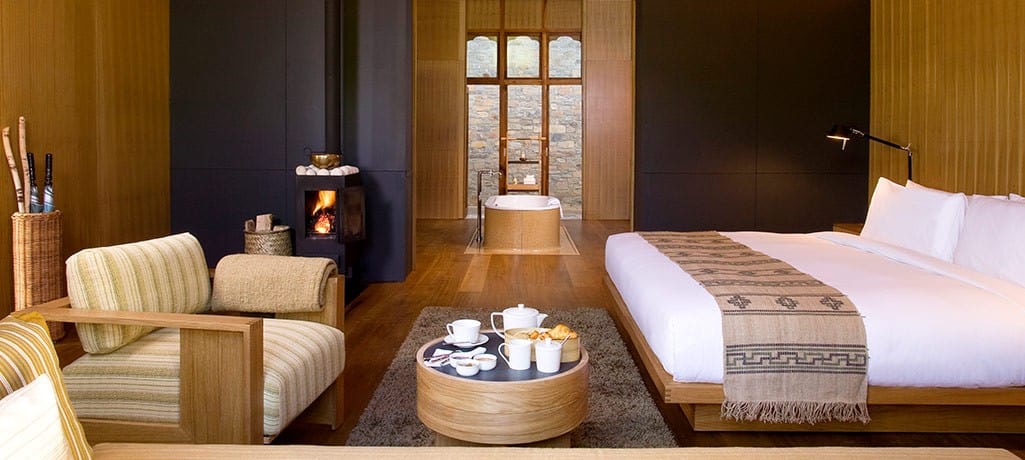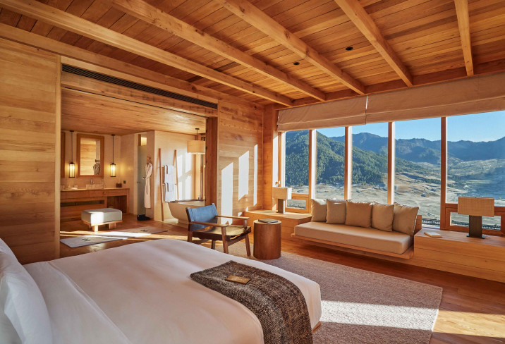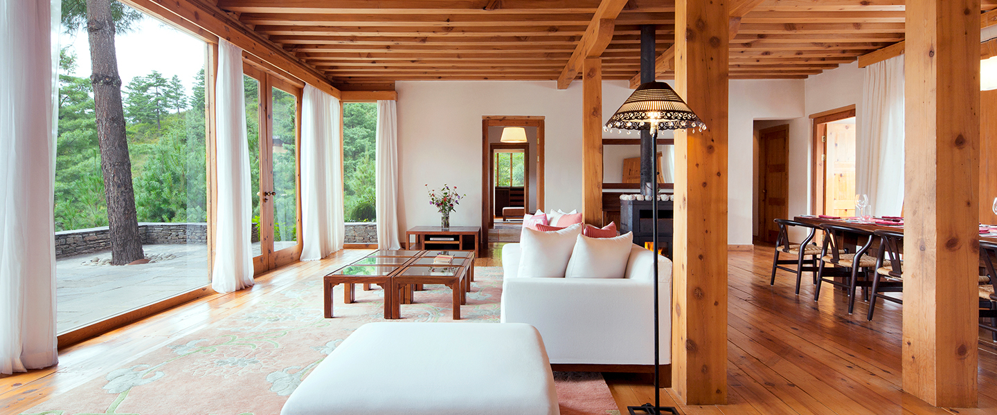 Das Six Senses Bumthang liegt inmitten eines Waldes. Grosse, bodentiefe Fenster schenken freie Blicke auf die umliegende Natur. Die grosszügigen Suiten sind harmonisch und natürlich ausgestattet und bieten herrliche Ausblicke in die Landschaft Bhutans.