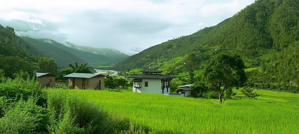 Das Uma Punakha liegt idylisch am westlichen Ende des üppigen Punakha Tales und bietet einen fazinierenden Ausblick über die terrassierten Reisfelder .