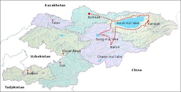 Beliebte Reiseziele: Issyk-Kul-See, Ala-Artscha-Nationalpark, Son-Kul-See, Tianshan-Gebirge, Arslanbob-Wälder, Tash-Rabat-Karawanserei, Osch, Jeti-Ögüz, Sary-Chelek-Naturreservat.